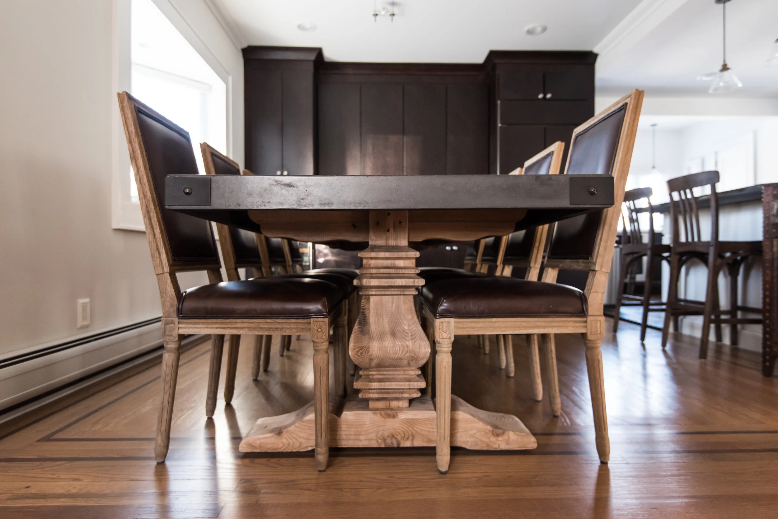 Existing interior wall between kitchen and dining room was removed to create an ‘Open Plan Concept’. Custom cabinetry layout was designed to meet Client's specific cooking and entertaining needs. New, larger open plan space will accommodate guest while entertaining. New custom fireplace surround was designed which includes intricate beaded mouldings to compliment the home's original Colonial Style. Second floor bathroom was renovated and includes modern fixtures, finishes and colors.